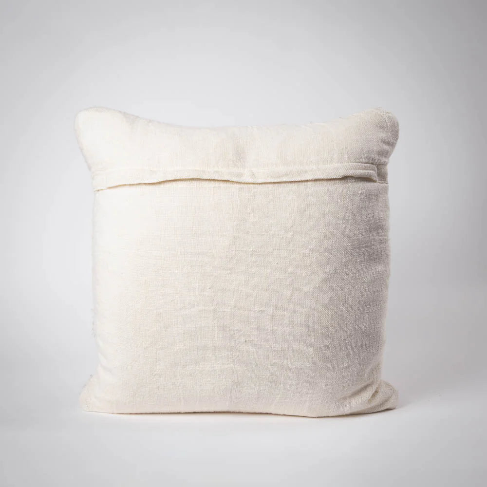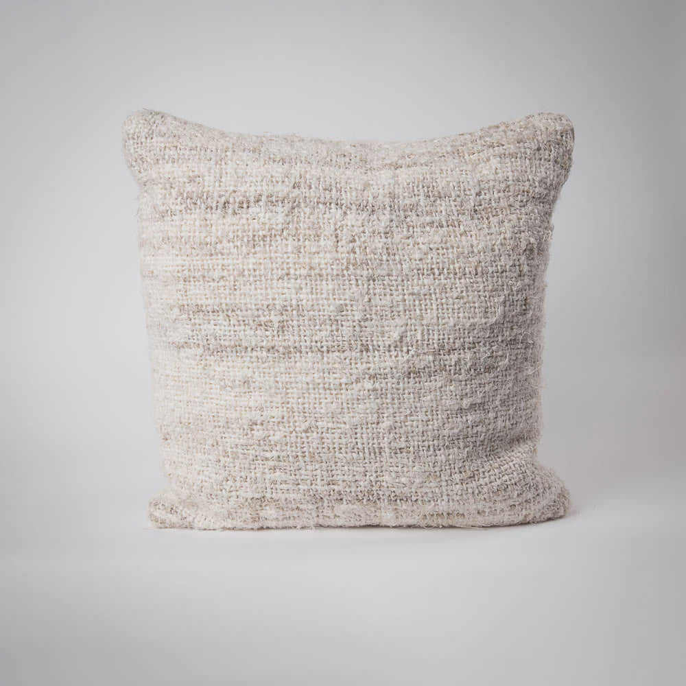 Each piece is hand-spun using the leftover linen yarns often discarded after a production run. Creating a raw and recycled nature to each piece, only adding to its innate beauty. The recycled linen weave of Wabi is chunky, irregular, highly textured & exceedingly deluxe. Wabi in ivory has irregular pops of natural yarn weaved into the face, accompanied by a plain ivory backing.