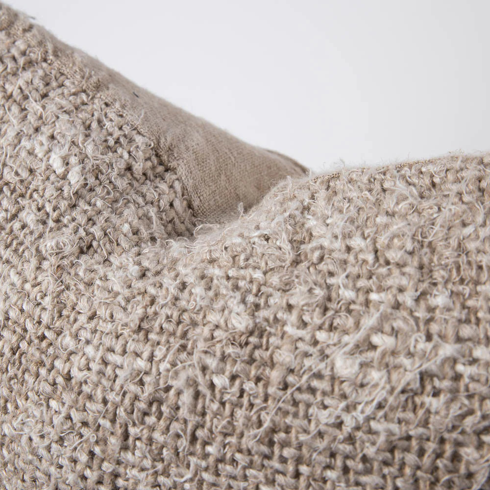 Each piece is hand-spun using the leftover linen yarns often discarded after a production run. Creating a raw and recycled nature to each piece, only adding to its innate beauty. The recycled linen weave of Wabi is chunky, irregular, highly textured & exceedingly deluxe. Wabi in natural has irregular pops of ivory yarn weaved into the face, accompanied by a plain natural backing.