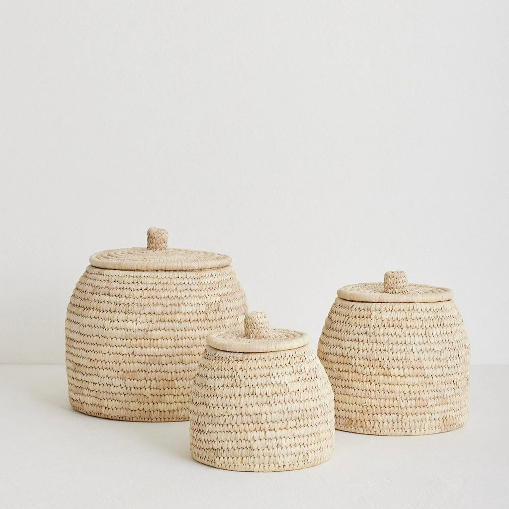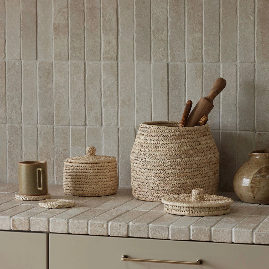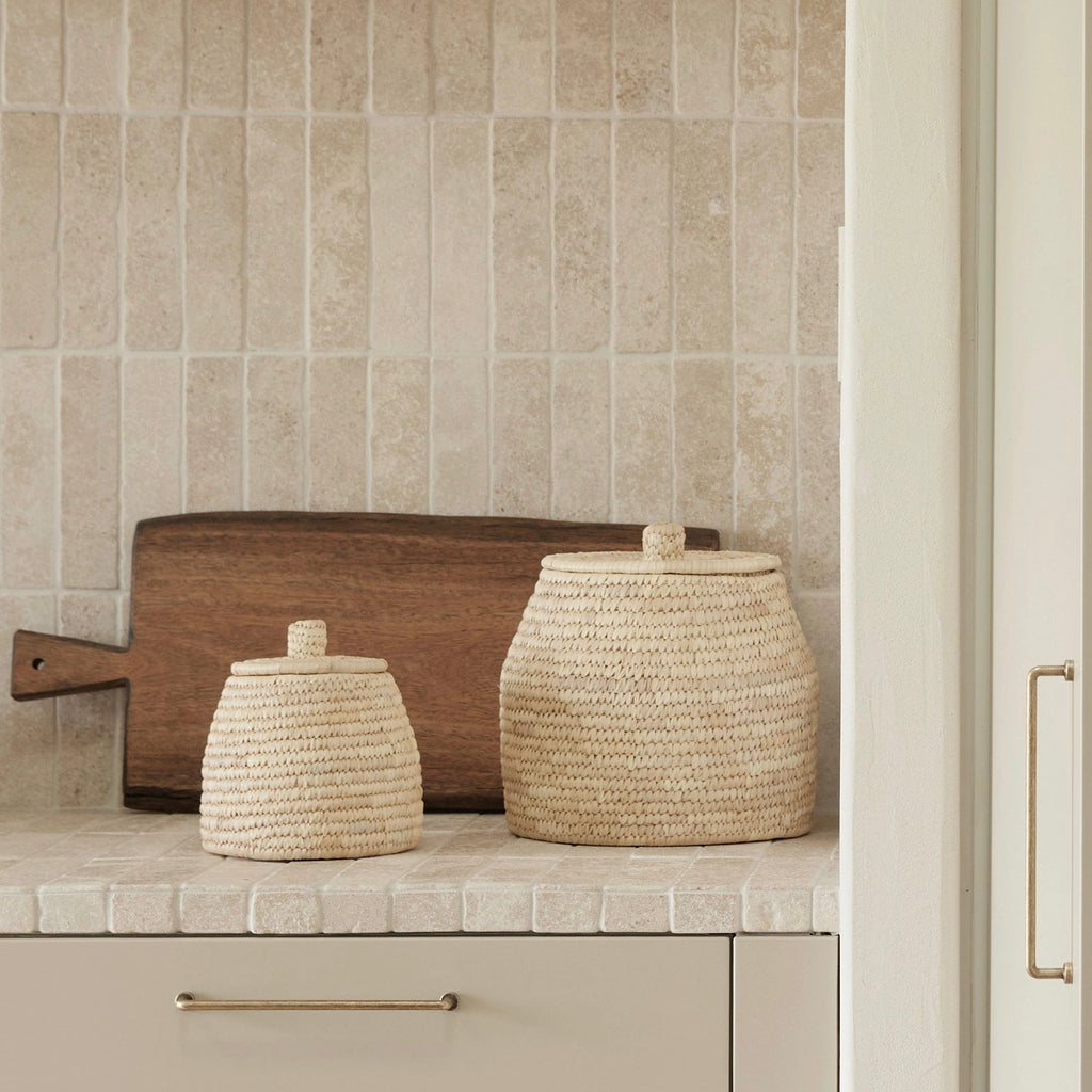 To design the palm fibre Dhali Baskets, we were inspired by an ancient Egyptian basket spotted in a museum several years ago. The beautiful curvaceous shape and woven texture are perfect for shelf, console or vanity styling. Available in three sizes, group two or three together for functional storage that creates a cohesive visual story throughout your home.