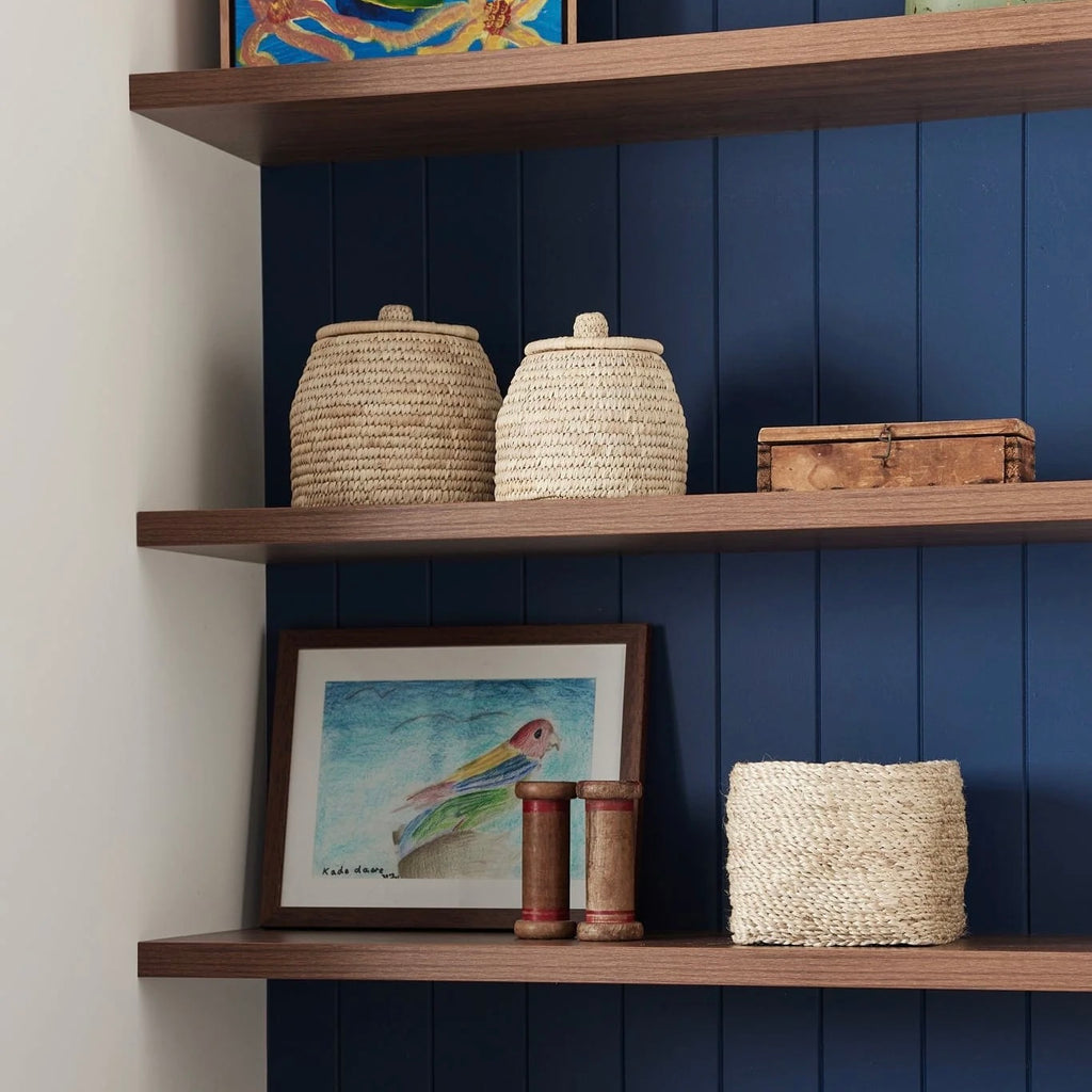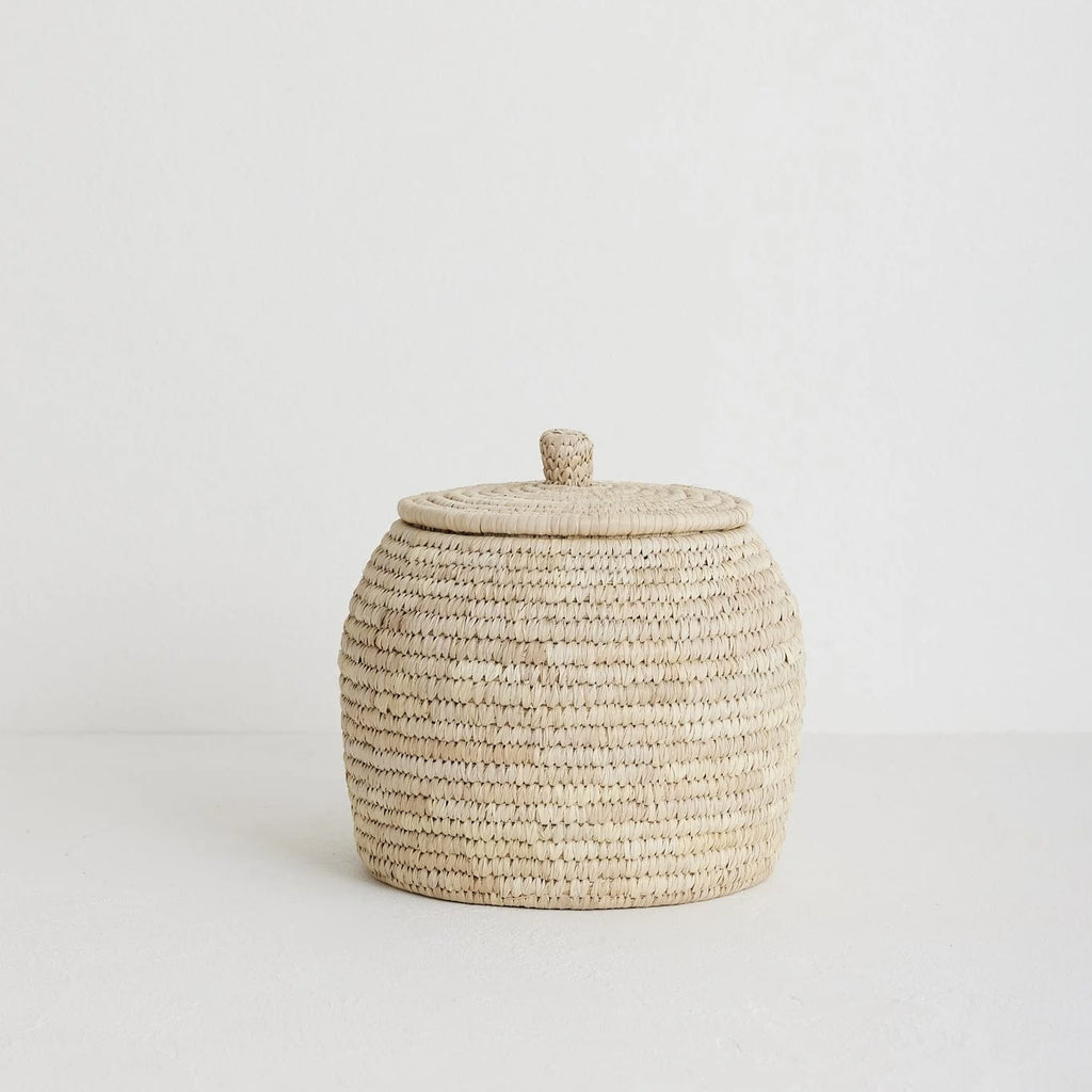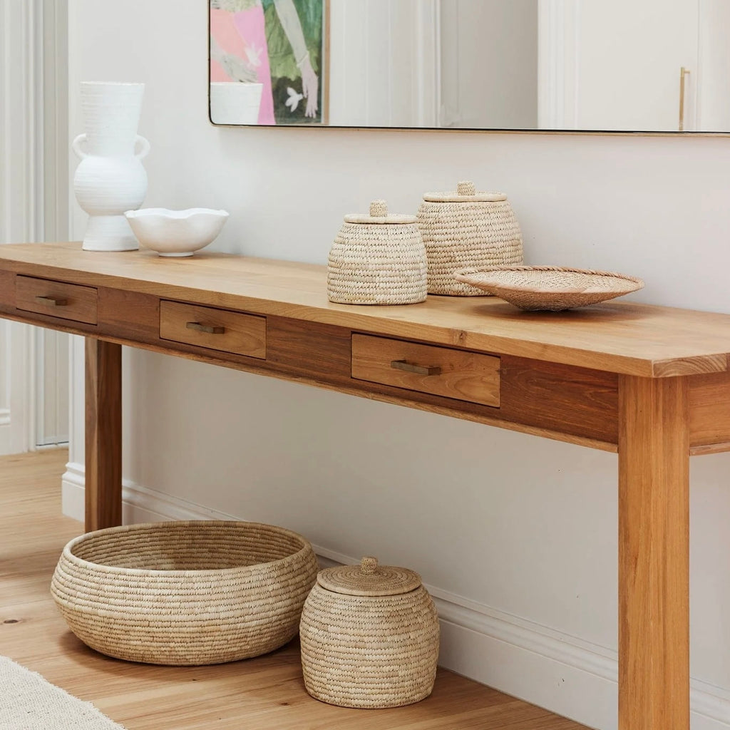To design the palm fibre Dhali Baskets, we were inspired by an ancient Egyptian basket spotted in a museum several years ago. The beautiful curvaceous shape and woven texture are perfect for shelf, console or vanity styling. Available in three sizes, group two or three together for functional storage that creates a cohesive visual story throughout your home.