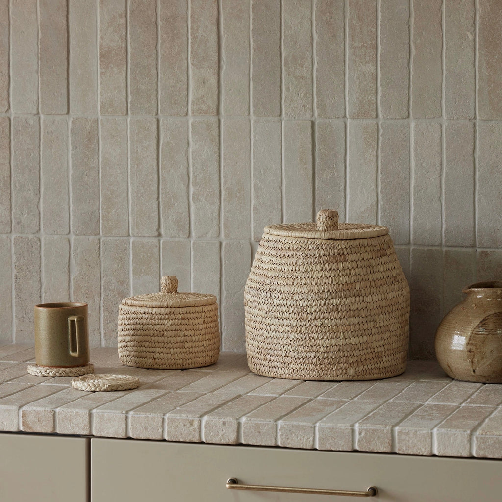 Featuring fitted lids, the Dhali Baskets are ideal for concealing those everyday items that you want to keep hidden, yet close at hand. Consider them for storage of skincare and beauty products in the bathroom; for coffee pods and packaged food in the kitchen; styled on a coffee table or shelf in the living room; to hold keys on a console in the entryway; or for storing small toys and craft materials.