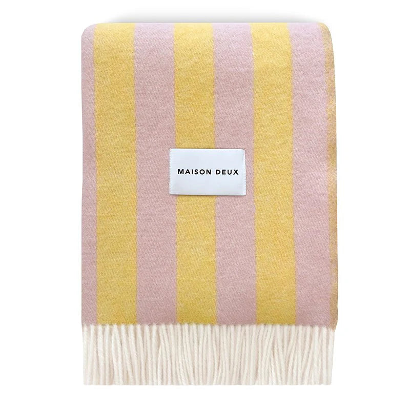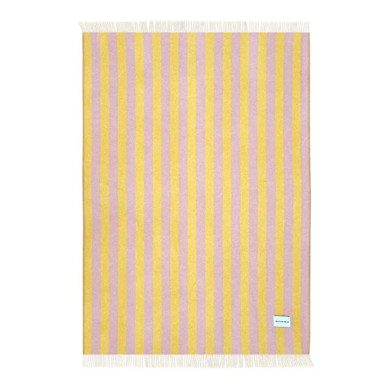 The Candy Wrap Blanket Pink Yellow is jacquard-woven from 100% New Zealand wool with fringes on the short sides. A thick premium blanket that is mirror-inverted on the opposite side. Measuring 130 x 200 cm, it's big enough to let someone join you. It keeps you warm and upgrades your living room in a split second.