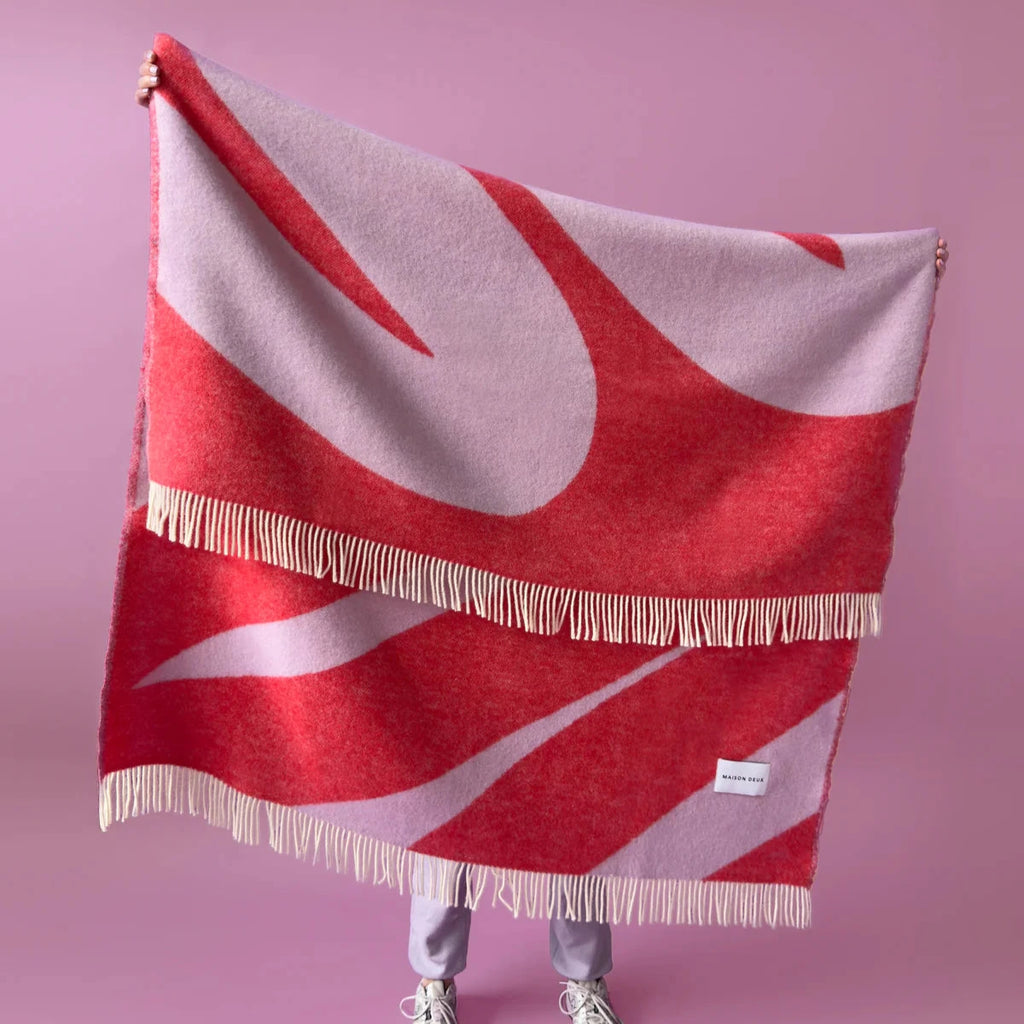 The Swirl Blanket Lilac Scarlet is jacquard-woven from 100% New Zealand wool with fringes on the short sides. A thick premium blanket that is mirror-inverted on the opposite side. Measuring 130 x 200 cm, it's big enough to let someone join you. It keeps you warm and upgrades your living room in a split second.