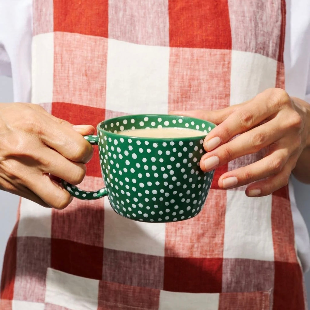 White sprinkles dance across a verdant green background the result of hundreds of hand painted spots on our Chino Mug Green Sprinkle. Each dot represents a moment of artisanal patience, applied by hand in our Vietnamese workshop from designs conceived in Sydney. The matching green handle and interior completes this earthenware piece that brings joy to everyday moments.
