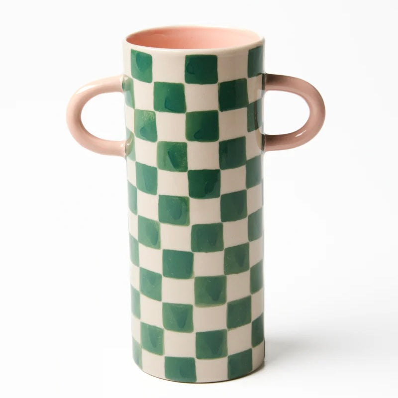 Cream and forest green checkerboards dance across this cylindrical vessel, creating a rhythm of pattern that feels very contemporary. The twin handles, invite interaction, while the hand-painted surface speaks to the artisan's confident brushwork. Perfect for a few sprigs of green or a single stem, this vase transforms even the most modest botanical into a statement.