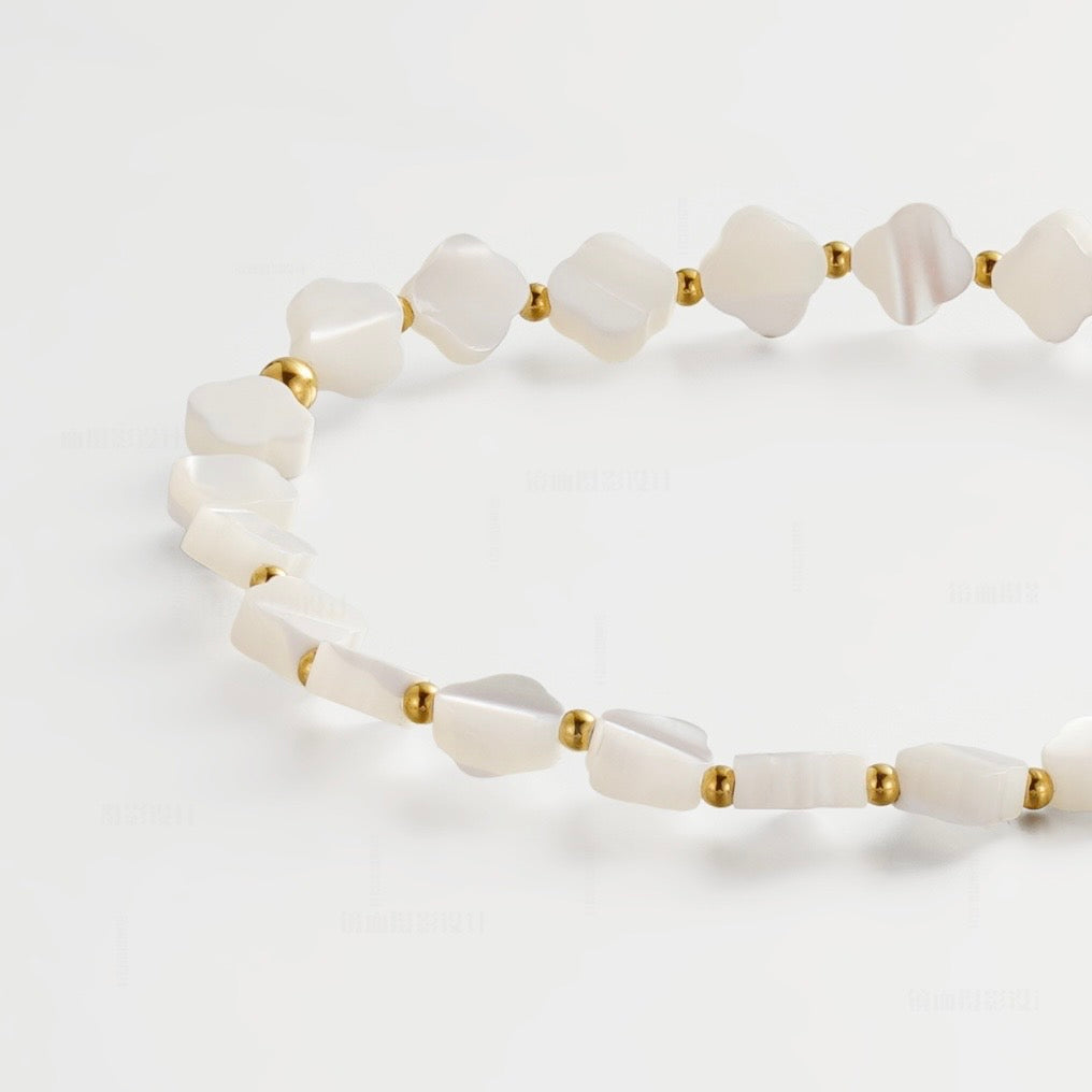 A refined beaded bracelet featuring softly faceted white stones accented with gold-tone details. Elegant and lightweight, it’s perfect for everyday wear, whether styled alone for a clean finish or layered with other bracelets for added texture.