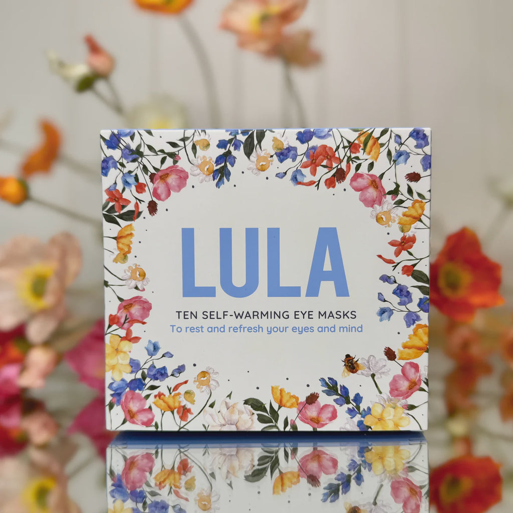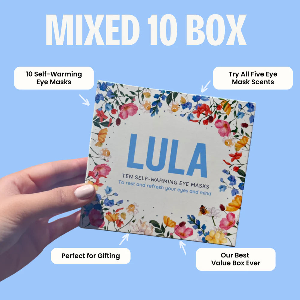 The new Mixed Box of 10 Self-Warming Eye Masks includes two of every Lula Eye Mask - 2 x Vanilla, 2 x Lavender, 2 x Rose, 2 x Jasmine and 2 x Unscented.Like a warm hug for your eyes and mind, this self warming eye mask starts warming up the moment you open it. Lie back, get ready to relax and unfold the mask. When the mask meets the air it begins to warm up, staying at a comforting temperature and releasing the subtle scents, so you can drift into a daydream or a deep night’s sleep. A beautiful gift of self-care, the subtle scents of Rose, Jasmine, Lavender and Vanilla can help relax, de-stress and assist with sleep.