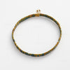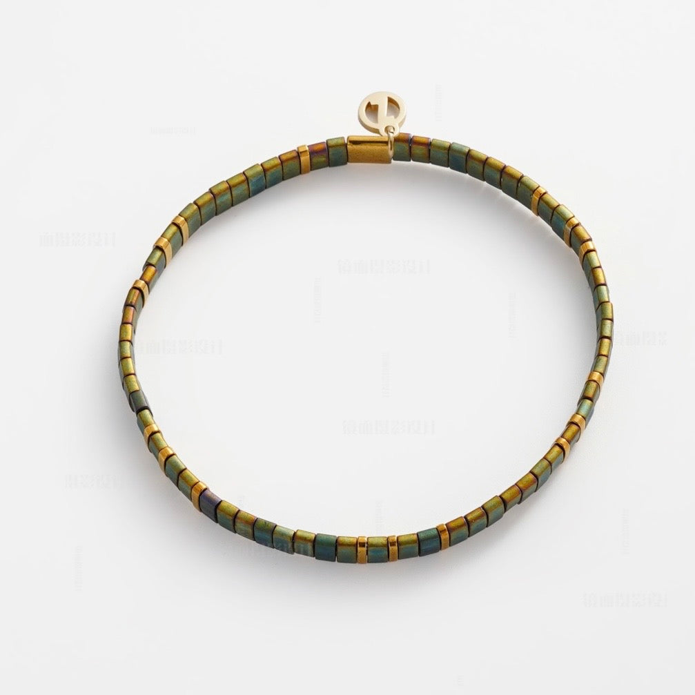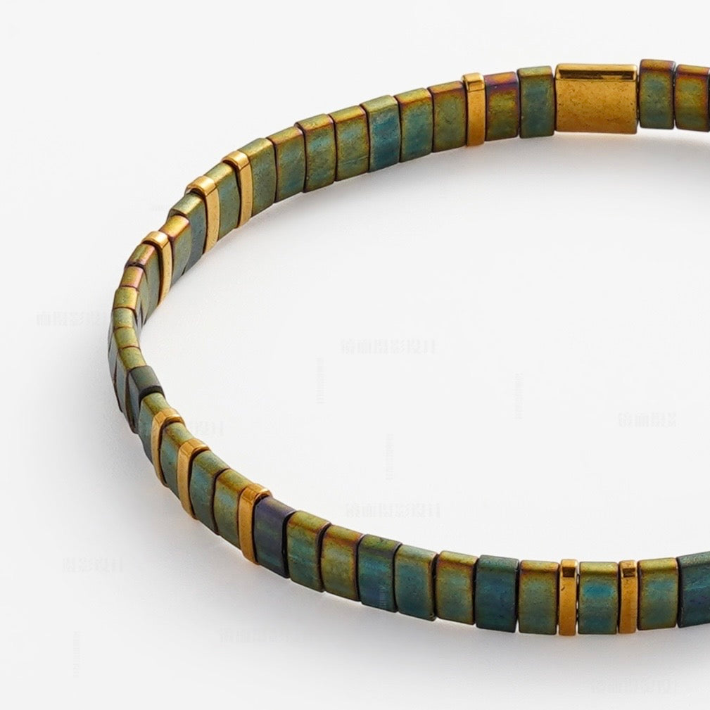 This minimalist bracelet is crafted from flat, rectangular beads in a deep iridescent olive. The dark, shimmering tones are balanced by slender gold-tone vertical spacers for a refined and modern finish.