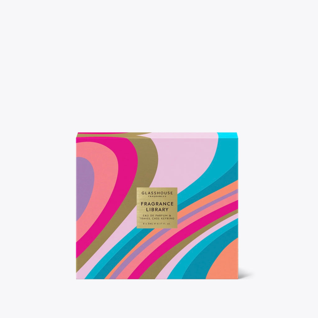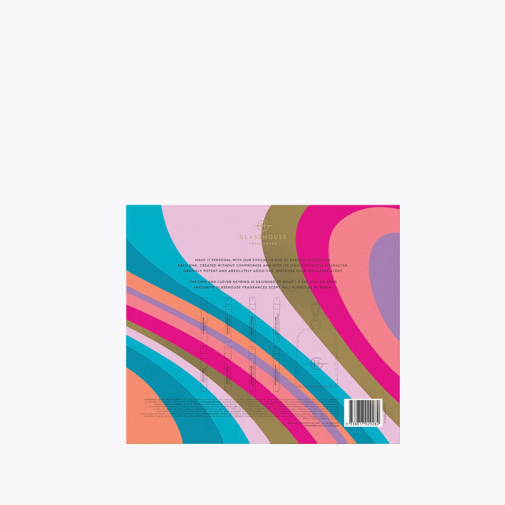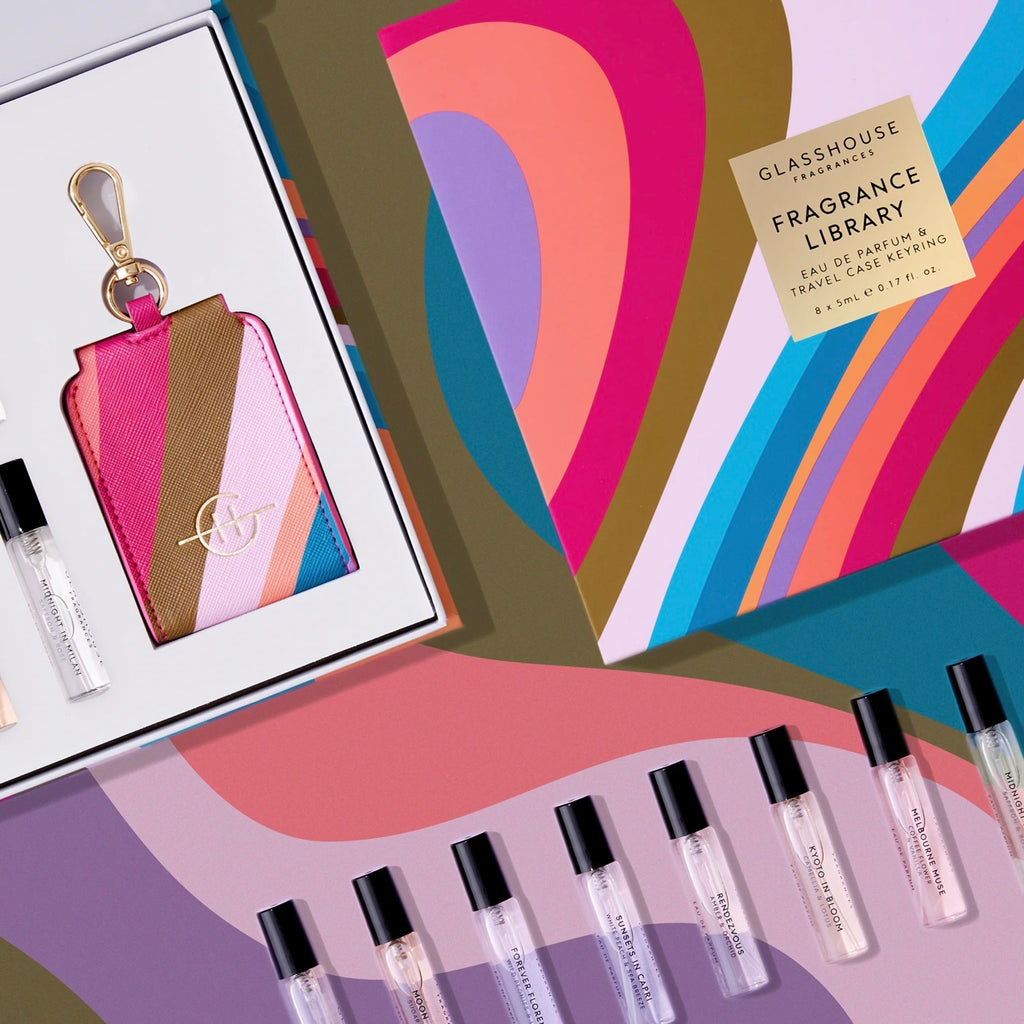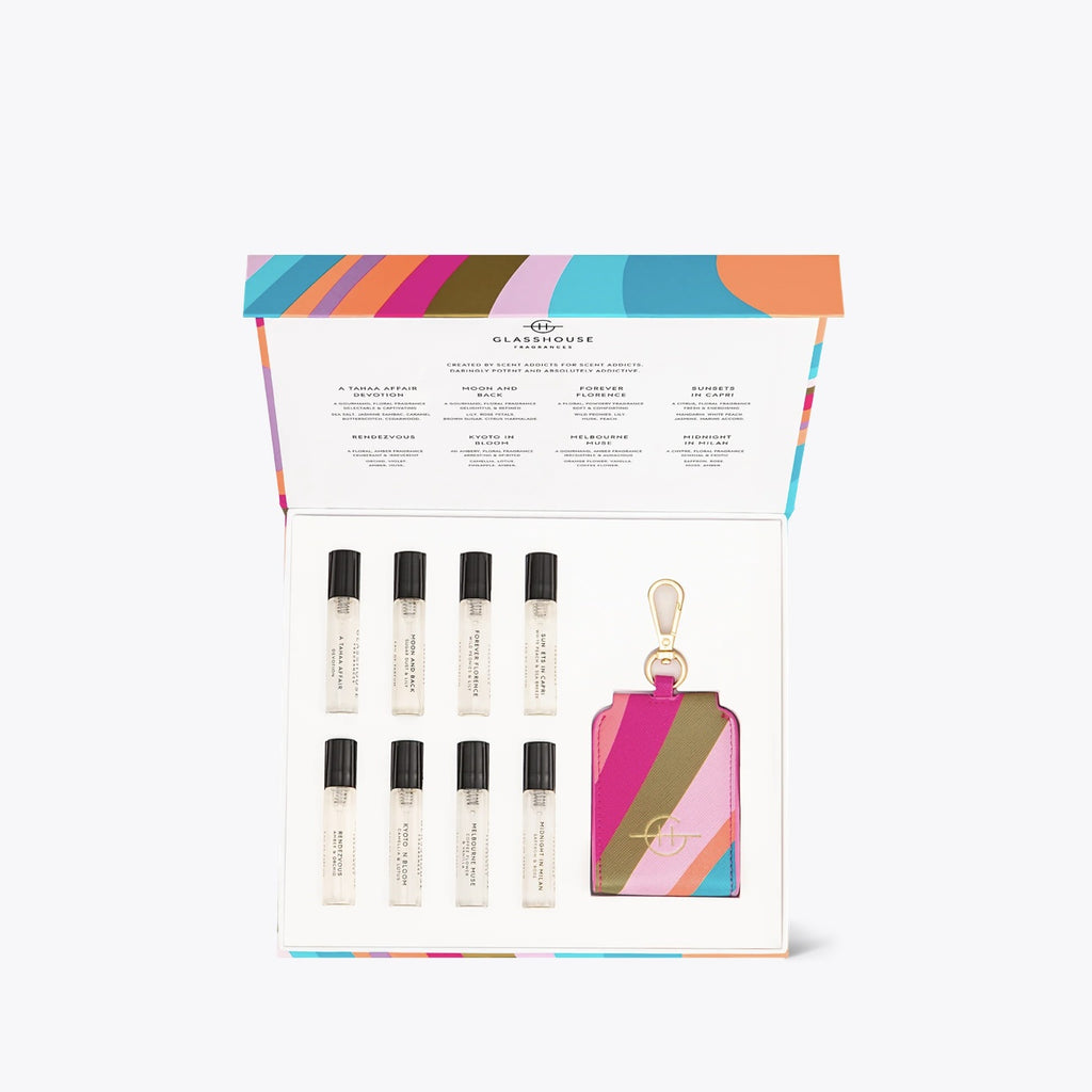 Contains 8 x 5ml Eau de Parfums and branded pouch keyring for 1 x 5ml vial