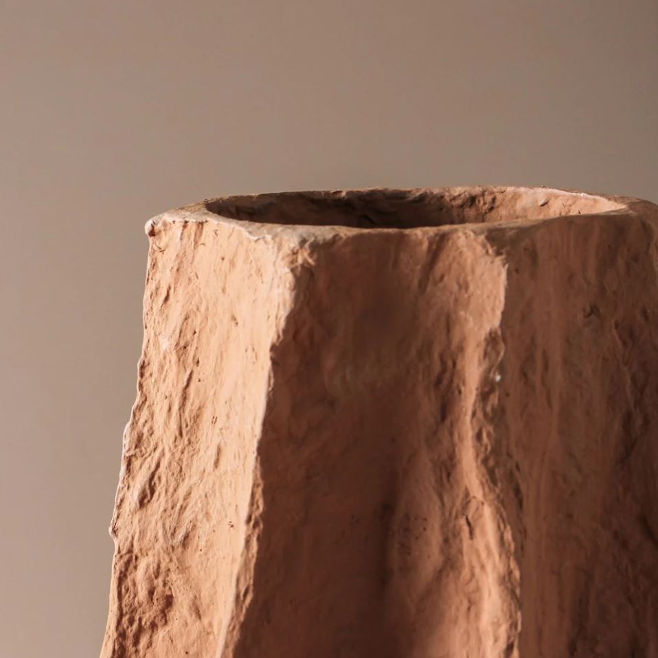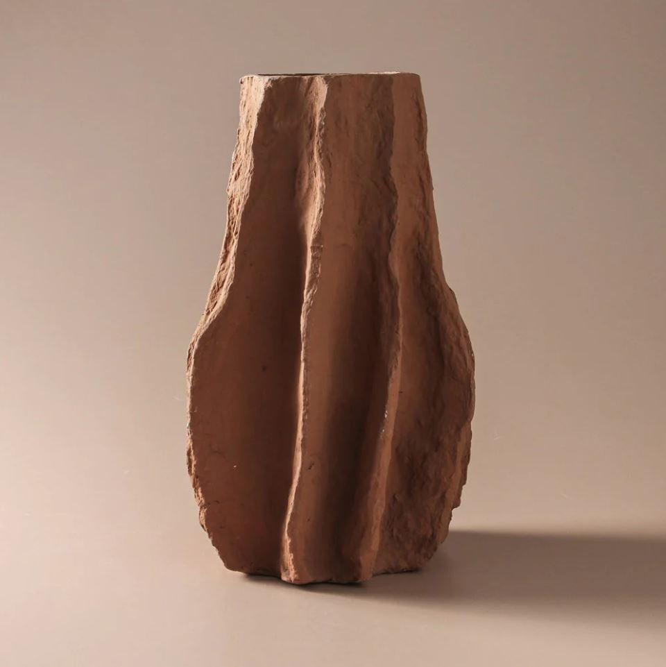 Celebrate the allure of nature's design with the Anica Vase - designed by our team in Jervis Bay who took inspiration from natural seedpod forms when creating this vase. Handcrafted with utmost care, this vase made from paper mache, stands as a testament to the art of handmade design. The Anica Vase's curvaceous shape and graceful contours draw inspiration from the organic elegance of forms and shapes in nature. Crafted in a rich amber color, the Anica Vase exudes warmth and timeless charm. Its earthy hue complements various interior styles. Whether displayed on its own as a striking art object or used to hold a bouquet of your favorite dried stems, the Anica vase effortlessly enhances the aesthetics of your living space. This paper mache vase cannot hold water. We recommend placing a smaller glass with water inside should you wish to display this vase with fresh flowers.