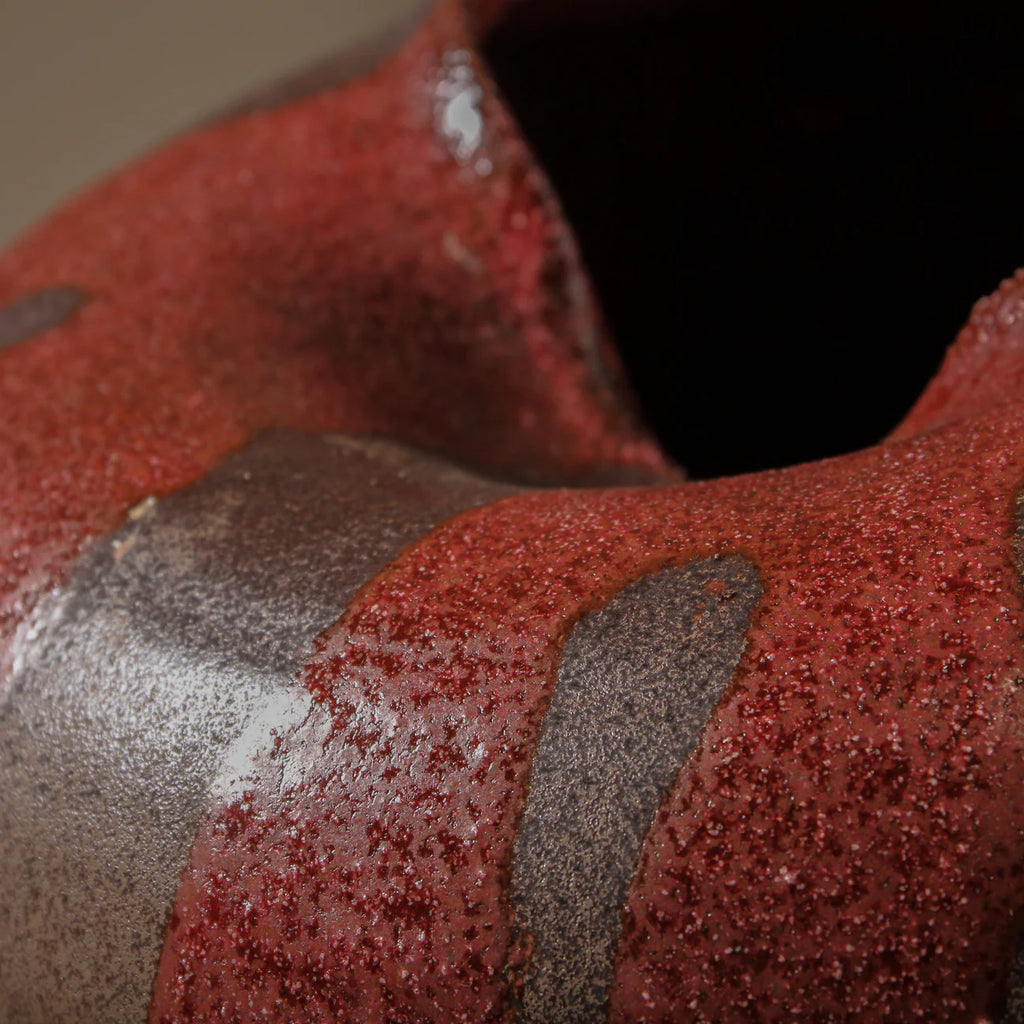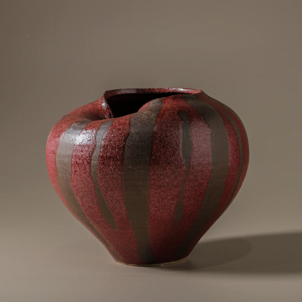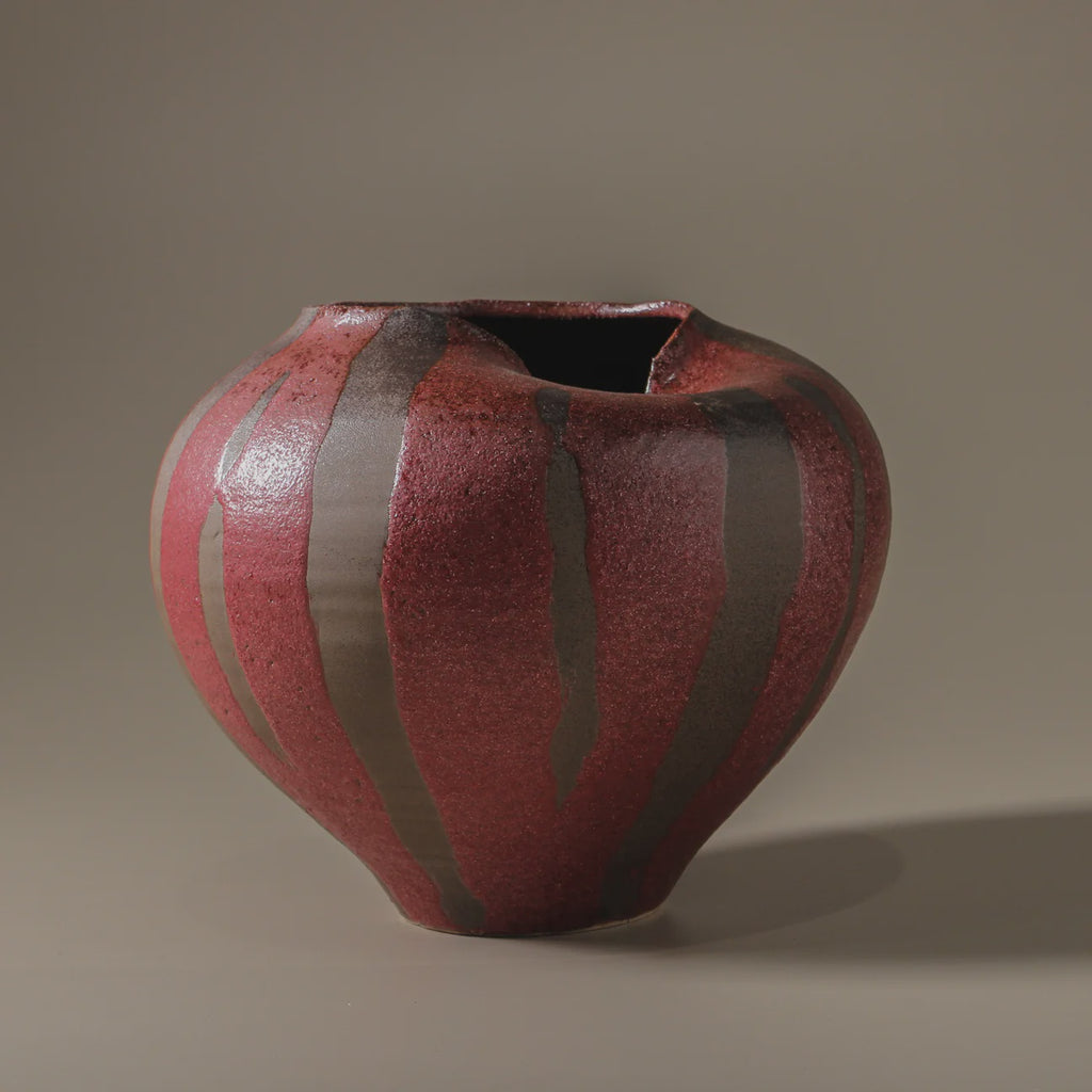 Combining a full-bodied, grounded form with organic fluidity, the Seraphina Vase features wavy contours and a rounded silhouette that feels both substantial and serene. Crafted in ceramic, its design is enriched by bold, thick stripes in deep burgundy and earthy brown tones, evoking the richness of natural landscapes and life's enduring cycles.