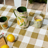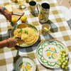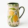 Sun-drenched lemons dance across this generous pitcher, their vibrant hues hand-painted against creamy earthenware. Designed with gatherings in mind, the emerald interior creates a striking contrast as you pour limoncello or wine for friends around outdoor tables. Lovely used in company with the Tavola cups, even by the bedside as a water jug.