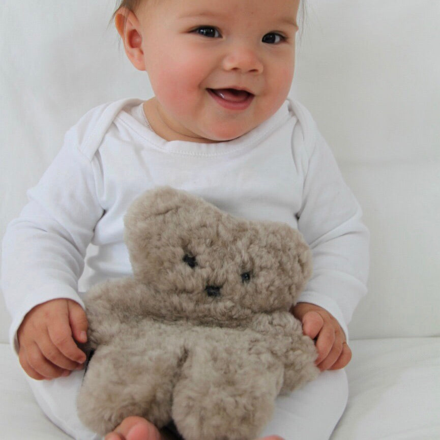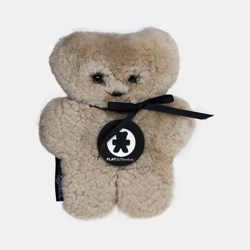 Soft, cuddly and flat, the FLATOUTbear is made of 100% Australian sheepskin shaped like a teddy bear. The FLATOUTbear is a unique product primarily used as a baby and children€™s comforter. It becomes a best friend and a well loved member of the family. 18cm tall x 16cm wide x 4cm flat Care: Cold spot clean and dry in shade. We suggest that you follow the SIDS guidelines as well as using a common sense approach when giving children the FLATOUTbear. Like with anything, we suggest parental supervision and we hope that the FLATOUTbear becomes a well-loved member of your family