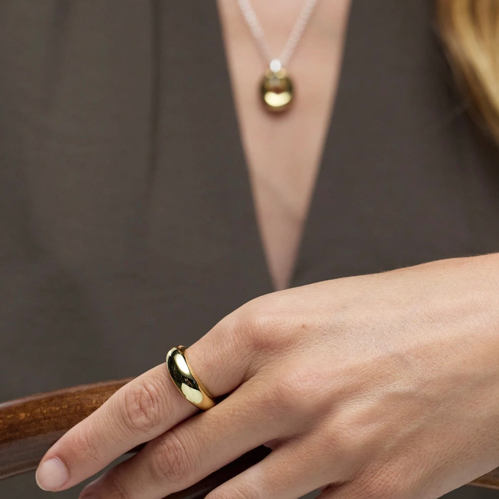 The Siena Ring is a timeless statement band featuring a smooth, sculpted dome silhouette with a high-shine gold finish. Minimal yet bold, its curved design creates a modern, polished look that pairs effortlessly with both everyday styling and elevated occasions.