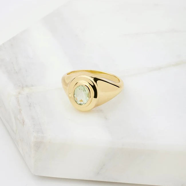 The Alex Ring is a modern classic, designed with a bold yet refined silhouette. Featuring a natural Green Amethyst at its centre, this statement ring brings a fresh pop of soft green against polished gold. Its clean, elevated design makes it the perfect piece to wear solo or to pair with other favourites for a layered, contemporary look.