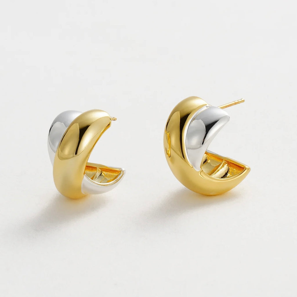 The Freya Hoop blends gold and silver tones in a bold, sculptural design that feels both timeless and modern. Its curved silhouette makes a statement while remaining versatile enough for everyday wear.