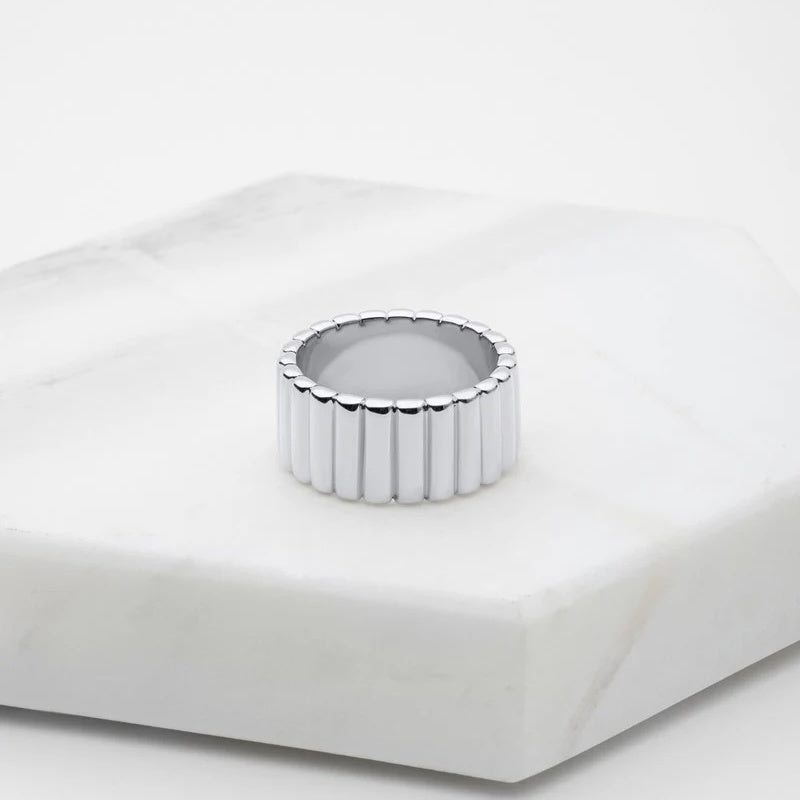 Bold yet refined, the Harlow Ring is crafted with a striking ridged design in polished silver tones. Its chunky silhouette makes it the perfect statement piece, while still versatile enough for everyday wear. Pair it back with our Harlow Hoops for a modern, coordinated look that balances edge and elegance.